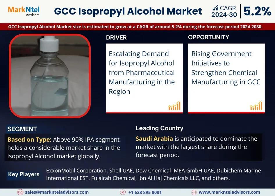 MarkNtel Advisors, a leading market research and consulting firm, has announced the release of its latest study titled GCC Isopropyl Alcohol Market Research Report: Forecast (2025–2030). This report provides a detailed assessment of the GCC Isopropyl Alcohol, covering its evolving dynamics, emerging trends, key growth drivers, major challenges, and competitive landscape.