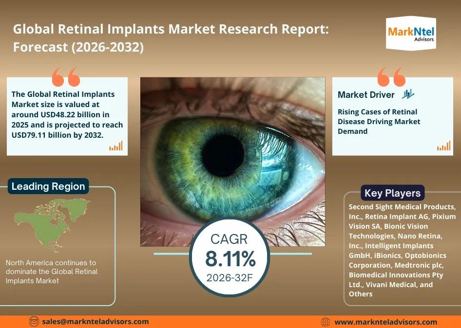 MarkNtel Advisors, a leading research and consulting firm, has announced the release of its latest study titled Retinal Implants Market Research Report: Forecast (2026–2032). This report provides a detailed assessment of the Retinal Implants Market, covering its evolving dynamics, emerging trends, key growth drivers, major challenges, and competitive landscape.
