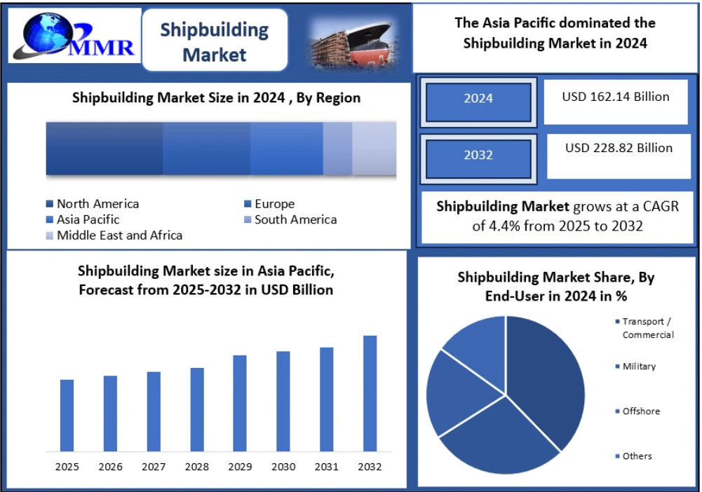 The Global Shipbuilding Market reached a valuation of USD 162.14 billion in 2024 and is projected to grow at a CAGR of 4.4%, reaching USD 228.82 billion by 2032. Shipbuilding remains a cornerstone of global trade and maritime operations, supporting over 90% of world cargo movement while driving economic connectivity across regions.